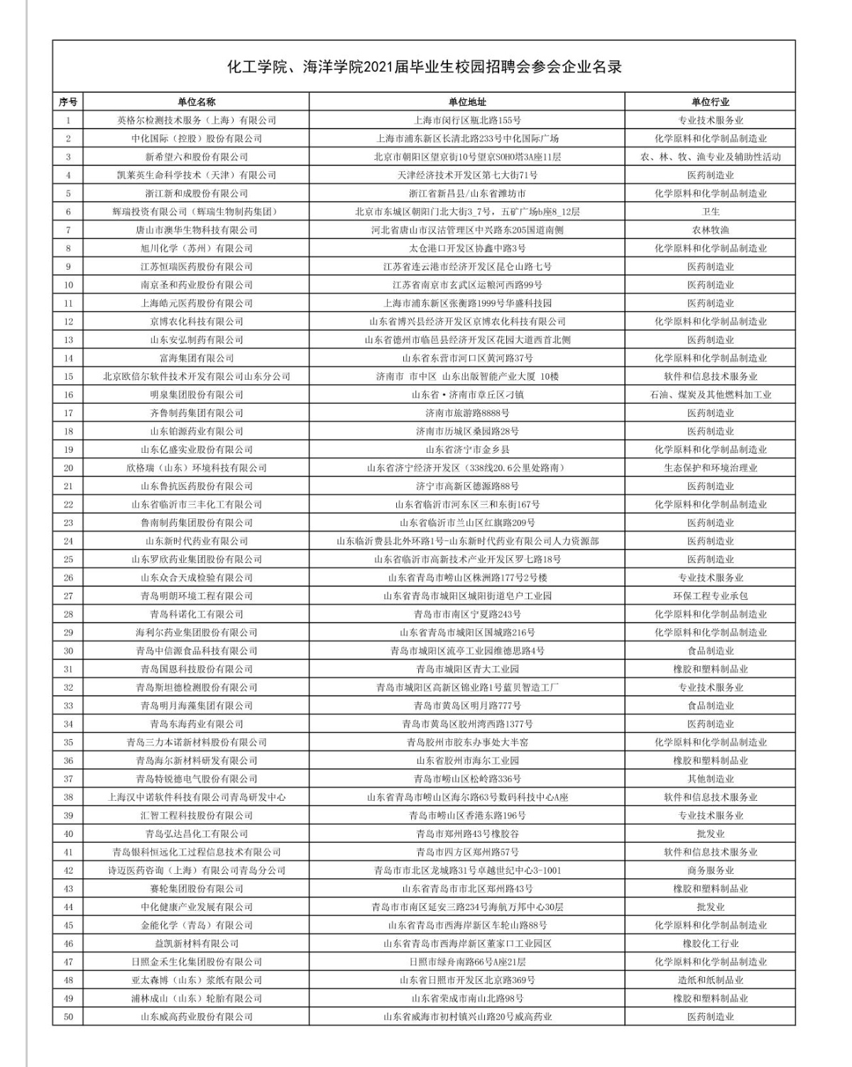 感谢对海洋学院、化工学院就业工作的长期关注与支持!为更好地为广大用人单位和毕业生搭建双向选择的平台,学院邀请了90家化工、医药、生命科学、海洋类企业单位(附参会名单),于3月30日下午举办“汇智共赢,直通名企”2021届毕业生校园专场招聘会。