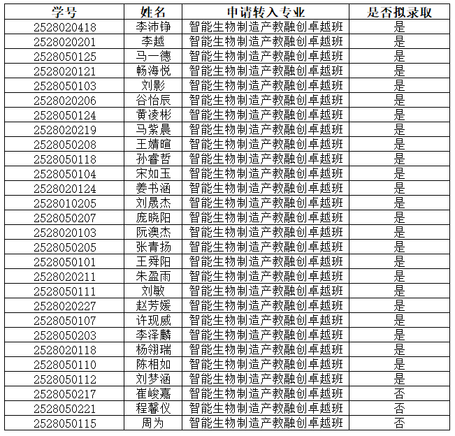 现将2025级学生转入生物工程学院产教融创卓越班拟录取结果公示如下。公示时间截止2026年3月16日。如有任何异议请反馈学院办公室: 电话0532-84022929。具体拟接收学生名单如下:
