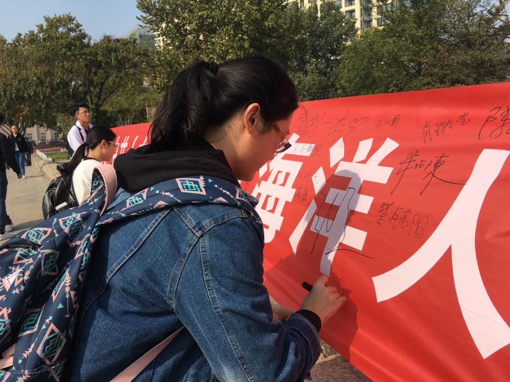 10月21日,海洋学院学生会在小五四北举办横幅签字活动,旨在通过签字活动加强学生争做最美海洋人思想意识。活动伊始,同学们纷纷在“喜迎中共十九大,争做五有海洋人“的横幅前驻足、关注并签下自己的名字。签名活动仅持续了一个小时,但横幅上已经签满了同学们的名字,大家用实际行动响应号召,以实际行动表明认真学习党的十九大精神。