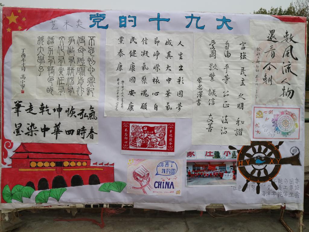海洋学院党员工作站结合工作实际,将十九大报告全文形成精炼的学习资料,组织全院学生进行学习。学生党员充分发挥带头作用,带领全院学生将自己的所学所感以丰富多样的形式展示出来,参与度高达90%。学习成果展示活动共收到作品271件,其中写作类作品195篇,原创诗歌19篇,板报类作品36幅,书法10幅,绘画11幅。作品形式丰富多彩,内容思想真实深刻,一幅“数风流人物,还看今朝”的书法作品苍劲有力,展示了海洋学子蓬勃向上,激流勇进的时代精神;一幅“不忘初心、牢记使命”的剪纸艺术栩栩如生,凝结了学生党员不负重托,一往无前的坚定信念;一首“你好,新时代”的原创诗歌气势恢宏,表达了新时代青年心系祖国,心有大我的家国情怀;“山海情”支教服务团队的摄影作品,新颖独到,展现了志愿者们无私奉献,勇于担当的服务精神;“心向十九大”、“共筑中国梦”等手绘板报线条柔和、色彩饱满,抒发了莘莘学子对祖国的大好河山、大美风景的无限热爱。经评委组评选,共选出李慧敏、陈怡乐、闫煦等同学的五十余幅优秀作品进行展出。展出伊始,同学们纷纷在展板前驻足、观看、热议,学习气氛浓厚,大家用实际行动响应党的号召,积极学习并践行十九大精神。
