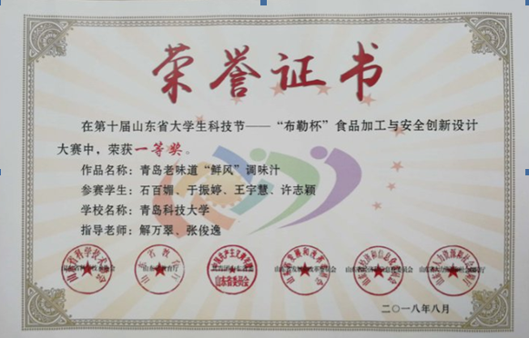 近日,第十届山东省大学生科技节——“布勒杯”食品加工与安全创新设计大赛在中华全国供销合作总社济南果品研究院众创空间举行。“布勒杯”食品加工与安全创新设计大赛吸引了中国海洋大学、山东农业大学、青岛大学、青岛科技大学等29所高校的279支队伍参加了本次大赛,最终86个项目进入决赛。青岛科技大学海洋科学与生物工程学院解万翠、张俊逸和马翠萍、王秀丹老师指导的两件作品荣获一等奖。