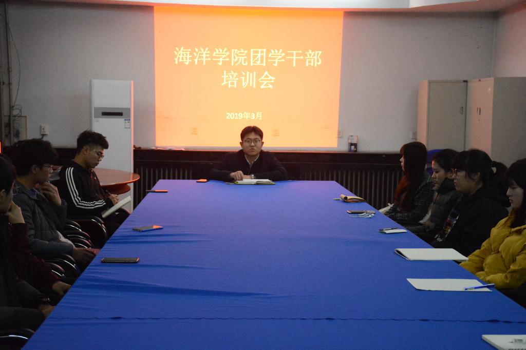 3月3日晚上7:00,海洋学院在精细楼205室召开以“悟往昔 看今朝 展未来”为主题的2018级团学干部培训会,会议由2018级辅导员季朝阳老师主持,2018级各班班长、团支书参加会议。