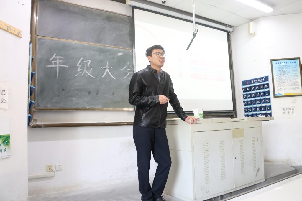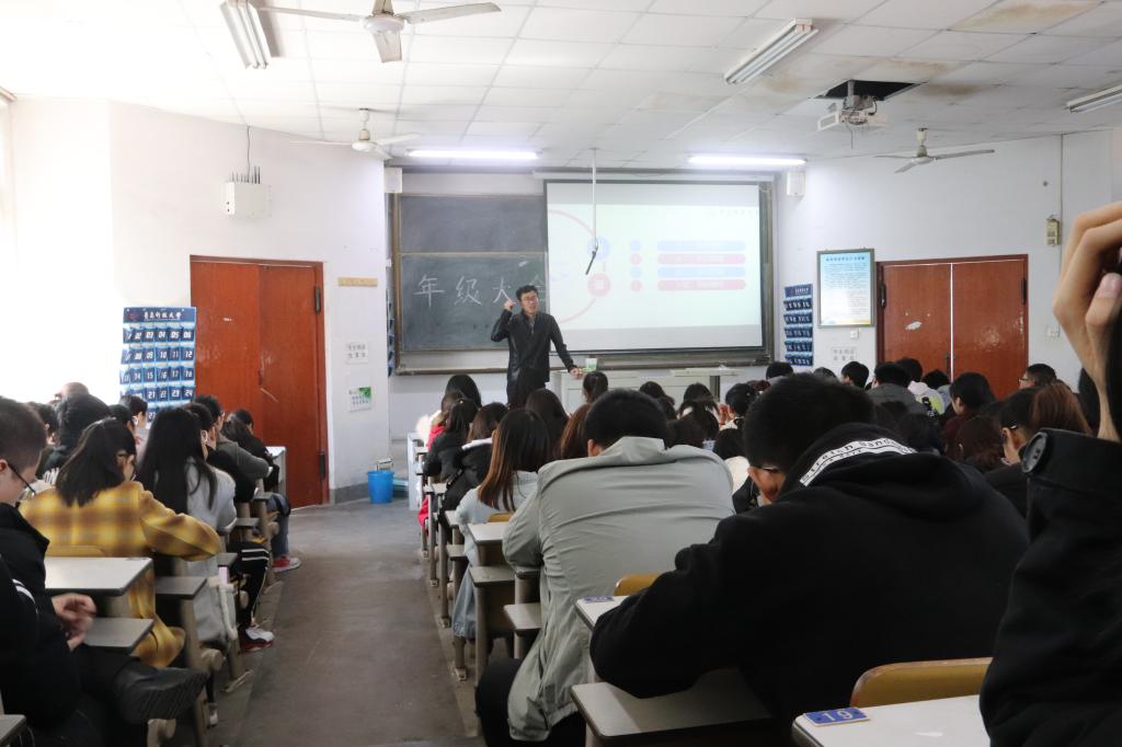 本次年级大会旨在对大二学生进行平日学习生活指导和考研现状分析。大会伊始,杜老师提出了“不畏未来,不念过往”的主题,告诫学生们要敢于拼搏,直面未来;要改过自新不再悔恨消沉。接着他强调了学生思想政治素质的重要性,并且分别从坚定政治信仰、落实核心素养两个方向给大家作出了相应的指导,他建议大家要多关注两会相关进程。其次,杜老师阐述了自己关于学业及获奖情况方面的看法,引用了翟天临学术造假事件,并针对兰州大学考研分数线已经连续上涨两次的新闻发表了自己的观点;他表明:随着时间的推移,考研的压力会越来越大。但同学们不要畏难不前,平日要积极参加学科竞赛和科技创新项目的研发。同时,杜老师提到要稳扎稳打,注重平日的学习。随后,杜老师又从学生干部的工作、社会实践情况、积极创建争做17级优秀典型三个方面出发,告诫同学们要增长自己的人生阅历,多参加社会实践活动。除此之外,杜老师还提出:要努力奋斗,实现年初给自己立下的小目标,并指导了海洋风采展的后续答辩和四月中旬发展新党员等相关工作的后续开展。