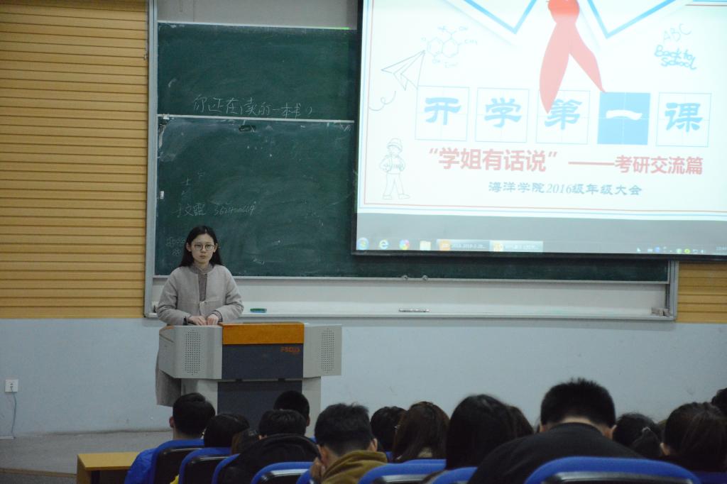 新学期,新气象,新征程,新起航---在大三这一关键分岔路口,为帮助16级学子解除心中疑惑,激发学习动力,树立正确奋斗目标,增强考研自信心,3月18日18:00,海洋科学与生物工程学院2016级于第二教学楼101教室召开“开学第一课”年级大会,此次大会由海洋学院2016级辅导员刘金岭老师主持,海洋学院2016级全体学生参加。