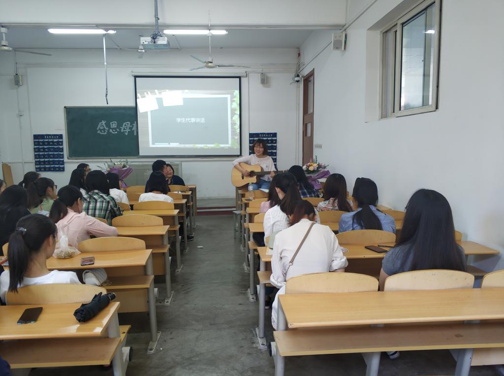 接下来,渠纯纯同学和王薇同学上台发言,回忆四年生活的点点滴滴,以及老师给我们上课时的场景。梁老师上生物化学课时,一直带着她厚厚的生化笔记本,非常认真负责地给我们讲课。谢老师即使在半夜也会回复同学们的消息,关心同学们的动向。随后,渠纯纯同学为大家自弹自唱了一首《理想三旬》,大家感慨良多。然后,进入时光信封环节,每个人手里拿着印有科大素描风景的明信片,在上面写下自己对未来的憧憬与期许,希望在三年以后,由班主任老师通过邮寄的方式交到同学们手中。