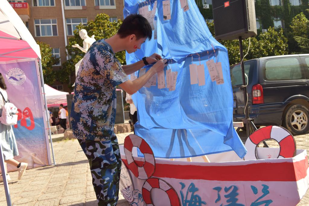 迎新场地设有“海洋号”帆船,吸引了新生及家长的注目,在新生报到处,每位新同学可以领取精美的明信片,写出自己对未来大学四年的规划或目标,悬挂至海洋号上,明信片将由学生会代为保存,在2019级同学毕业典礼结束时返还。此活动旨在帮助新生初步规划大学生活,相信新生会不忘初心,带着家长们的期盼,向着既定目标扬帆起航。