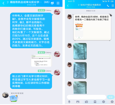 本学期有《精细有机合成单元反应》和《生物质能源》两门专业课程的教学任务,因为疫情不能正常开学,在开学前一周参加了学校组织的培训—— “超星”“爱课程”等多个教学平台的使用,根据自己课程的需要,为了尽可能达到比较好的教学效果,我选择了“爱课程-中国大学MOOC”平台,并引入了课程上和本课程教学内容和目标比较相近的两门课程《精细有机合成化学和工艺学》和《生物质材料与能源导论》。开学前对两门课分别建立了QQ群,将两门课在平台上建立了SPOC课程,在QQ群里里指导学生注册并选课。采用QQ群和课程平台相结合的方式给学生进行线上教学,提前两周将教学内容发布到平台上,对每周的学习内容和重点,提前在QQ群和MOOC平台上发布公告。在学习的过程中指导同学们一边听课一边做笔记,不明白的内容下课后QQ群中再集中进行讨论。学生学习状态非常积极,很多同学把他们记录笔记还有手写的作业发给我点评,平台上显示已经上过的几次课都是全勤,并且观看次数和观看时间都是满格。再课堂之余,还教授同学们如何进行文献查阅和撰写文献报告,全面提高他们的各项技能。