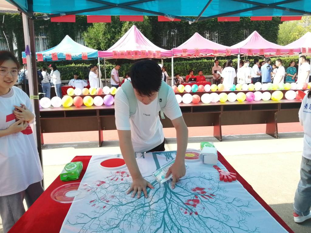 海洋学院突出学校七十年校庆,制作校史校情海报及学院简介,组织2020级新生提前学习校史、校情、校歌,新生在迎新现场中合唱《青春校园》校歌,并在背景展板上印上自己的手印,切实增强2020级新生对科大人的身份认同、情感认同、价值认同。