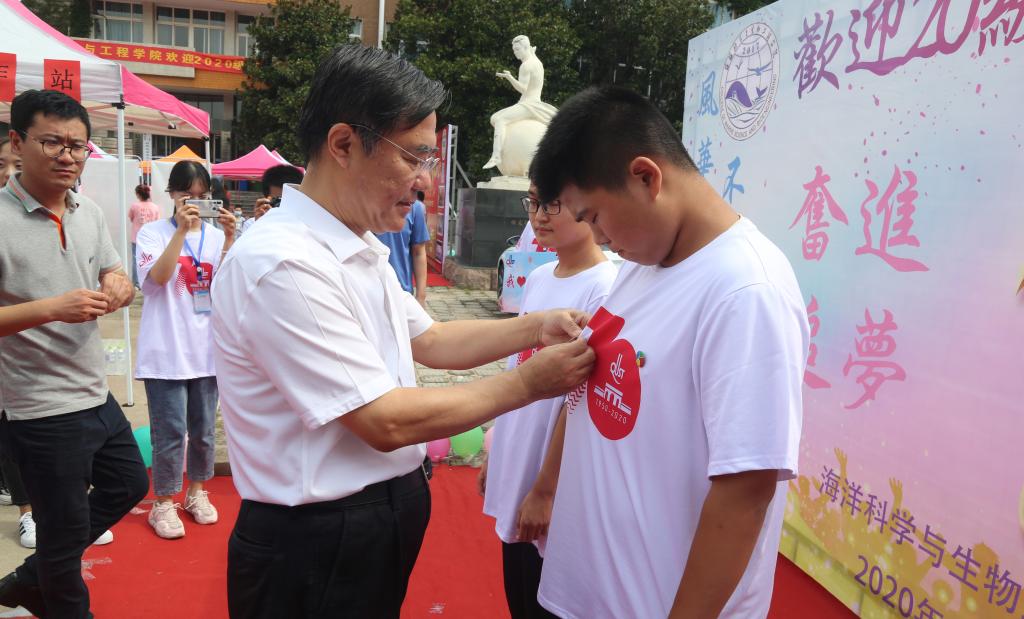 在迎新现场,校党委书记马连湘为两位名字中含有“海洋”的2020级新生代表肖海洋和陈海洋亲自佩戴校牌、海洋学院院徽,并深情寄语全体海洋学子要牢记科大人使命,传承科大家风,在科大七十年校庆这一新起点,在海洋学院学有所成,为科大、为青岛做出更大的贡献。