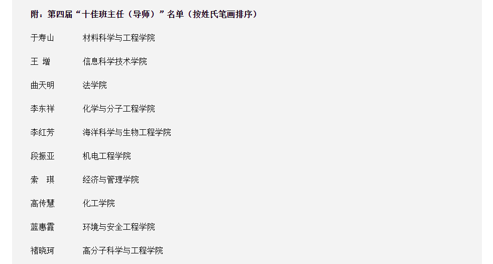 根据《青岛科技大学十佳班主任(导师)评选办法》(青科大学字﹝2014﹞30号),学校组织开展了第四届“十佳班主任(导师)”评选。经过学院推荐、学校审核、学生评议、大众投票和评审委员会投票等环节,海洋学院李红芳老师获评青岛科技大学第四届“十佳班主任(导师)”称号。