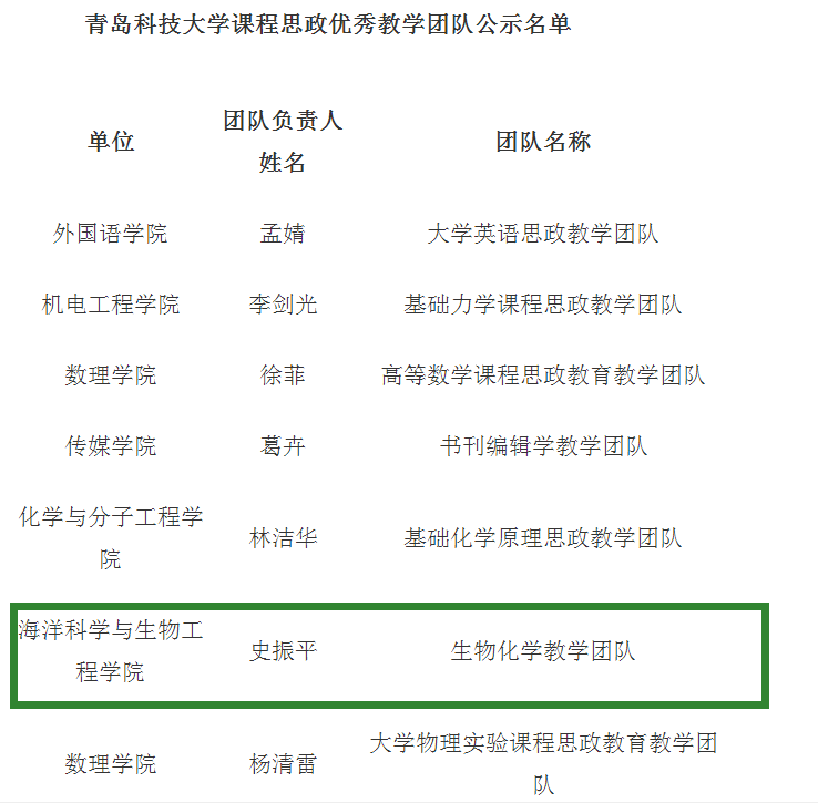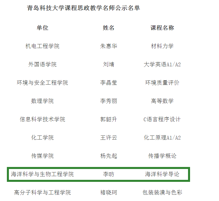 近日,学校对青岛科技大学课程思政教学名师、课程思政优秀教学团队评选结果进行公示,海洋学院李昉老师获青岛科技大学课程思政教学名师荣誉称号,史振平负责生物化学教学团队获课程思政优秀教学团队。