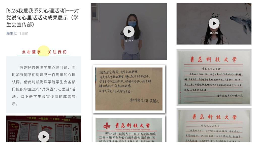 打开心扉诉真情,对党说句心里话。为更好的关注学生的心理问题,有针对性地为学生解决心理困扰,海洋学院结合建党100周年主题,以学生会各部门牵头组织“对党说句心里话”主题活动,带动学院同学将对党的感情抒发在一句句话语中,表达自己对党的热爱。