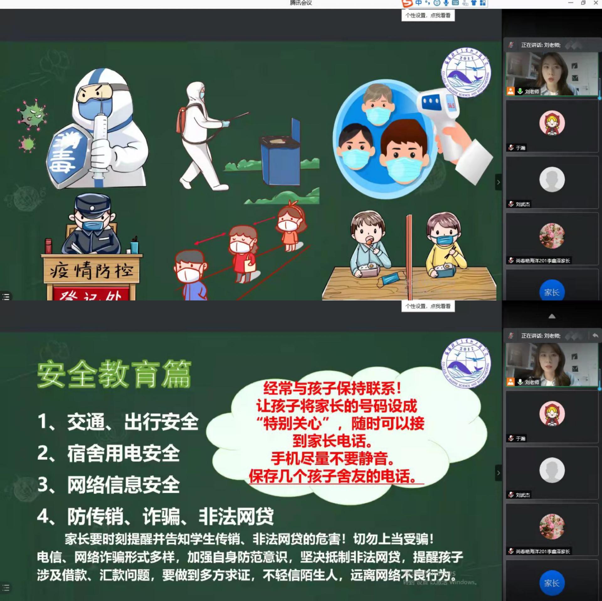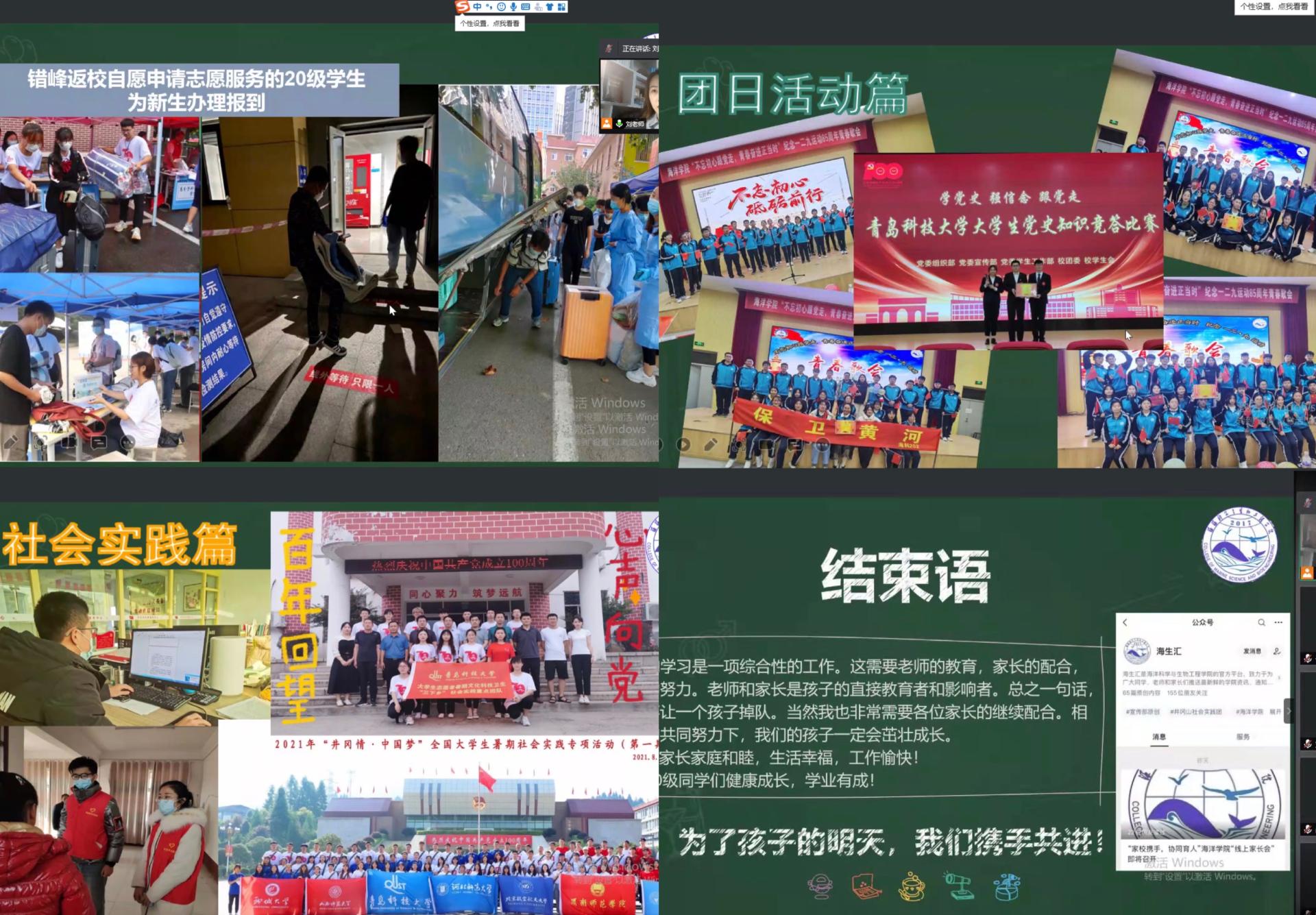 刘金岭首先向学生家长介绍了学院具体情况和学院特色,就专业方面做了简单叙述。在学业科研方面,学院本着以生为本的理念,本着为学生负责任的态度,推行集体自习、班委一对一、一对多帮扶机制等,使学习困难学生得到帮助。为学生搭建“海创汇”平台和“海之角”五育工作坊,为学生提供学习、科创研讨的空间。疫情防控一直是常抓不懈的,希望家长们能够配合学院、学校安排,严格遵守服从国家政府关于疫情防控的要求和排查。在安全教育方面,一直都是各大高校关注的问题,刘老师就防诈骗问题再次着重强调,学院携手家长共同防范电信诈骗,杜绝受骗案例的发生。在心理健康方面,提高家长对心理健康重要性的关注度,在与学生的交流沟通中发现问题及时疏导并联系辅导员老师,同时也介绍了学校心理健康教育与研究中心的基本情况,希望家长与学院携手让学生身心更加健康。