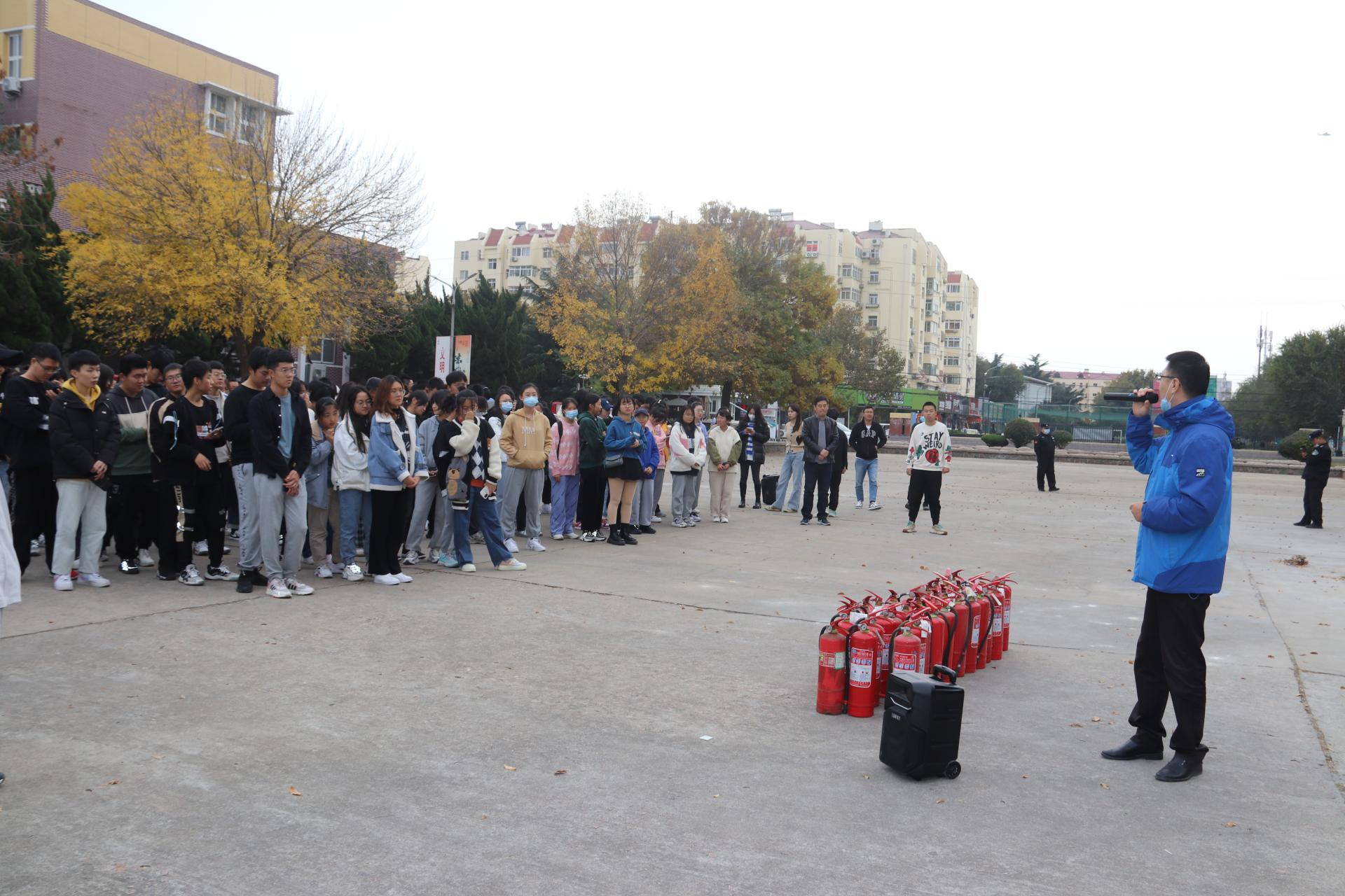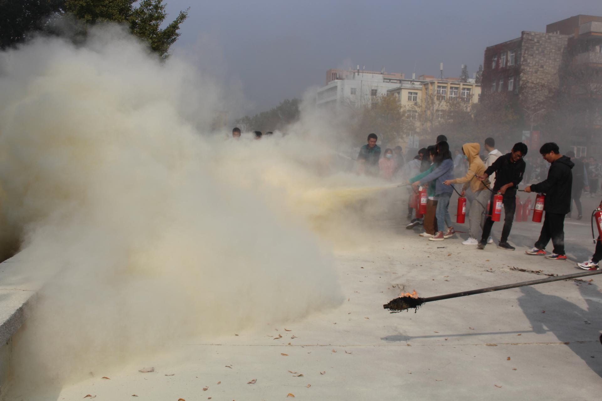 在小五四广场举办的灭火演练中,仇立峰讲解了初起火灾处置方法和灭火器使用规范,现场同学做了学习运用。