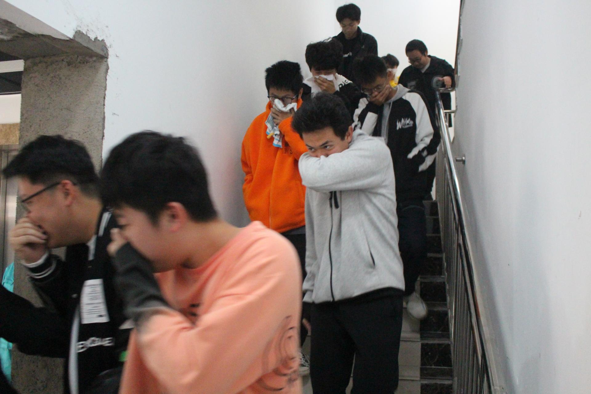 演练过程中,学生针对高层宿舍发生火灾的情况进行模拟,从发现火情、合理处理、研判形势、及时上报、紧急疏散等多个环节进行演练,切实从应对火灾的实战出发,学生有序从26号楼15层撤离,有效提升了学生对火情的判断、自救能力。