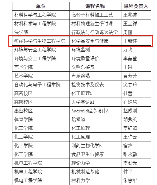 近日,学校公示了青岛科技大学课程思政示范课程评选结果,其中,海洋学院王新萍副院长主讲的《化学品安全与健康》入选校级课程思政示范课程。