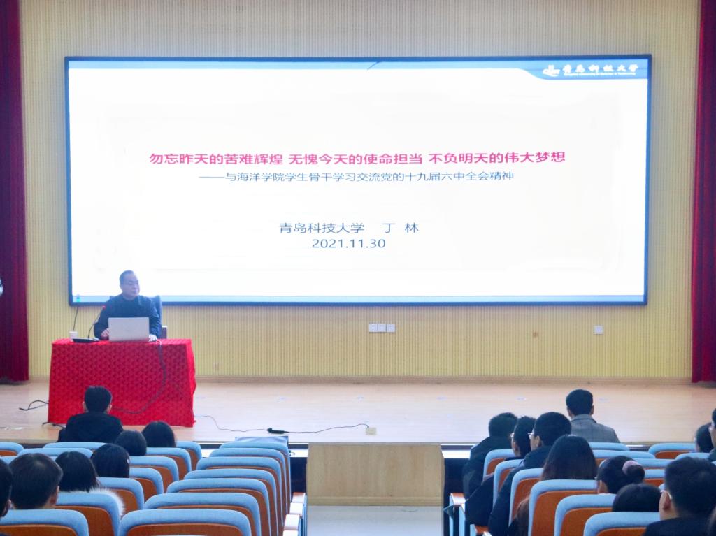 11月30日下午,学校党委常委、副校长丁林在尚舜学术报告厅为海洋学院作党的十九届六中全会精神专题报告,学院部分班子成员、学工办教师、学生党员、入党积极分子参加学习。