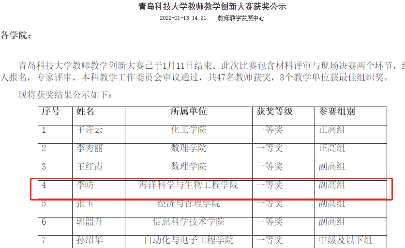 近日,学校对青岛科技大学教师教学创新大赛进行获奖公示,我院李昉副院长获得一等奖(副高组),吉喆老师获得二等奖(中级及以下组)。