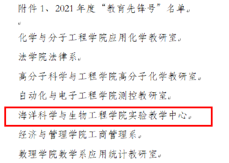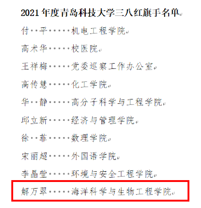 海洋学院解万翠教授荣获“三八红旗手”,实验中心荣获“教育先锋号”;实验中心、食品质量与安全教研室荣获“先进集体”,王松林、王霞、张久明、孙素莉、李浩、周昉荣获“先进工作者”;李昉荣获“先进女职工”,张慧、王秀丹、杨芳、李红芳荣获“工会先进工作者”。