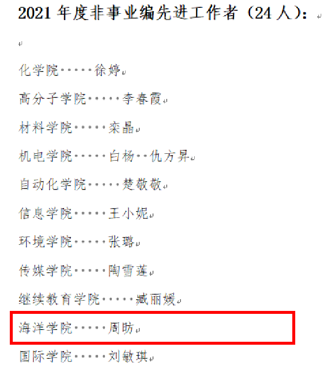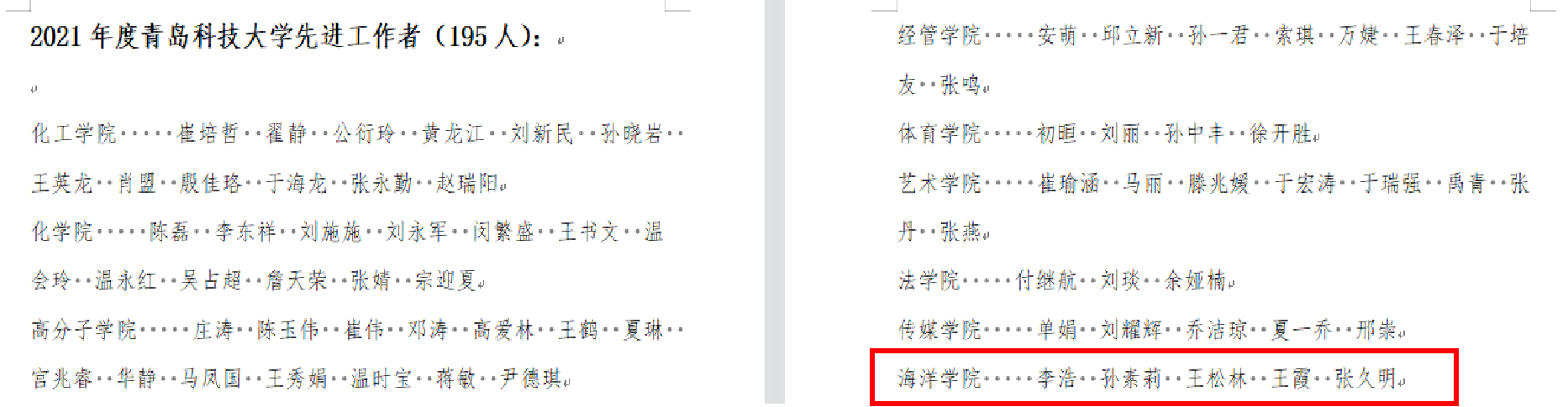 据悉,该称号经各单位民主推荐和评选,并征求学校相关部门意见,由评选工作小组评审,校党委常委会研究,评选出2021年度青岛科技大学先进集体68个、先进工作者195名、高密校区纳入当地控制总量人员先进工作者14名,劳务派遣人员先进工作者24名,教育先锋号10个、教育先锋10名、三八红旗手10名、三八红旗集体3个。