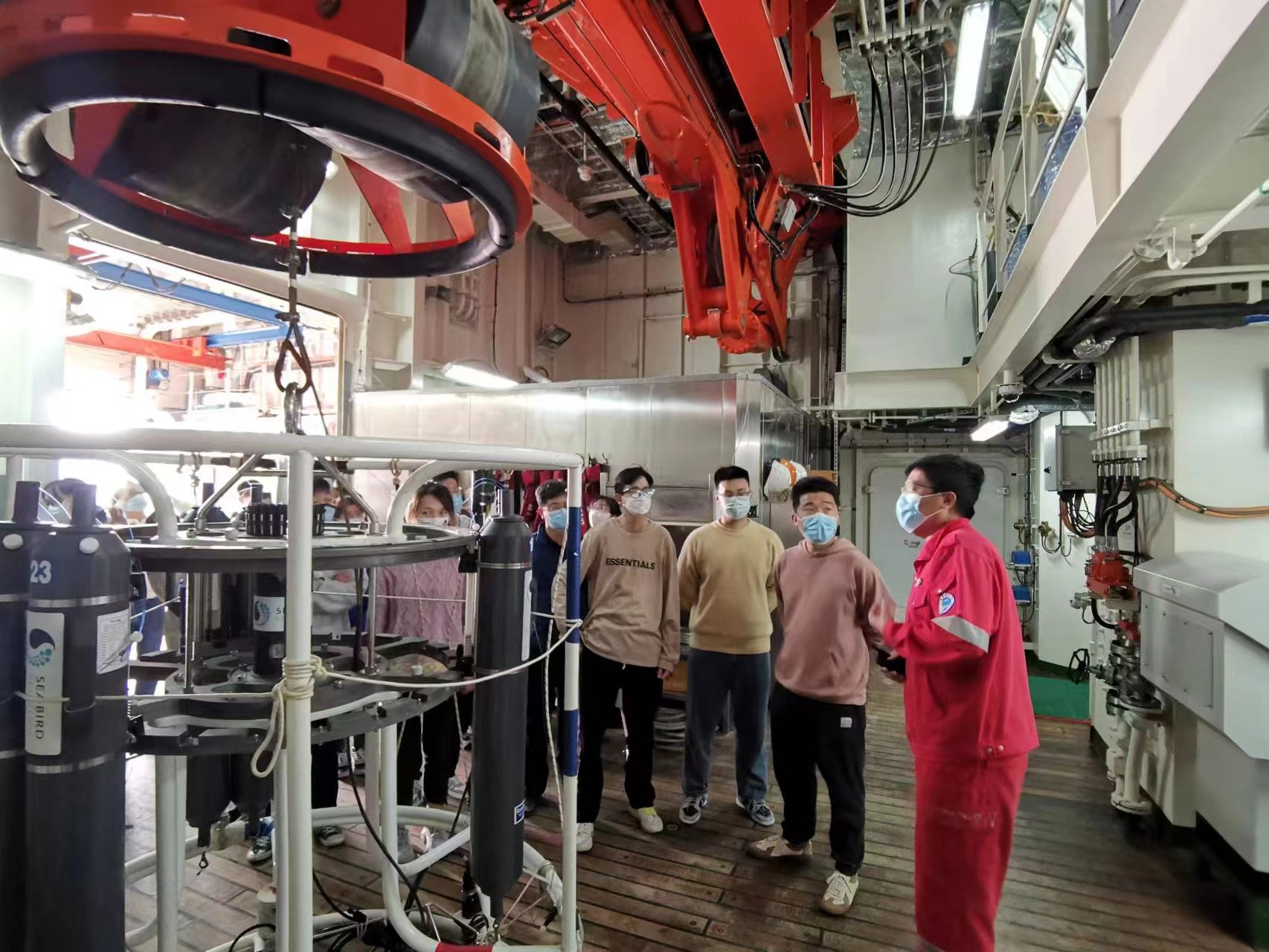 研究生分组参观驾驶室、生活区和实验区。二副驾驶员介绍,“驾驶室相当于船舶的大脑,‘东方红3’有一颗聪明的大脑。”他向实习师生介绍了雷达和电子海图等主要屏幕,带领师生参观了驾驶室构造,同学们坐上驾驶椅体验“船长”身份。船上实验室教师带领同学们观摩实操CTD(温盐探测仪)探测与样品采集全过程,对如何测量海洋温度、盐度、深度等方法作了讲解。
