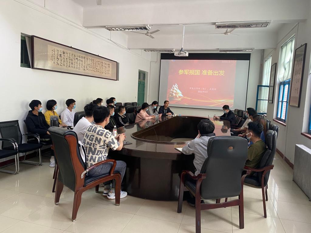 为进一步提高学生参军入伍积极性,宣传最新征兵政策,动员更多科大学子参军入伍,4月22日下午,党委学生工作部(处)、武装部副部长曹永俊在四方校区第二会议室为海洋学院、环境学院意向入伍学生进行宣讲,海洋学院党总支副书记兼副院长臧传永及两学院辅导员参加。