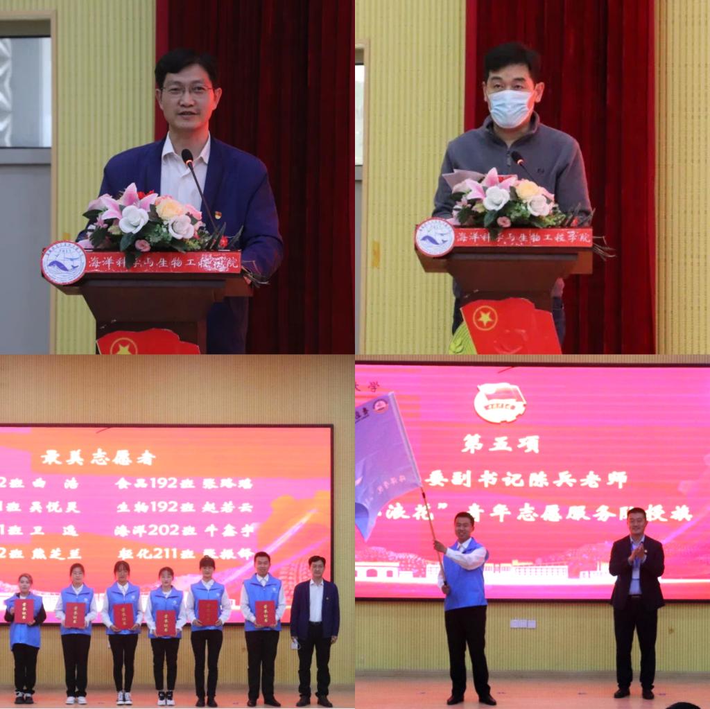 周宪锋为学院“最美志愿者”颁发荣誉证书。他在讲话时要求,团员青年要肩负起时代使命,争做“五个模范”,要把追求进步落实到坚定信念、刻苦学习、无私奉献、严守纪律等各方面,谱写新时代的青春之歌。臧传永宣读《关于成立海洋科学与生物工程学院“小浪花”青年志愿服务队的决定》以及《关于授予曲浩等8名同志青岛科技大学海洋科学与生物工程学院“最美志愿者”称号的决定》。陈兵为“小浪花”青年志愿者服务队授旗。