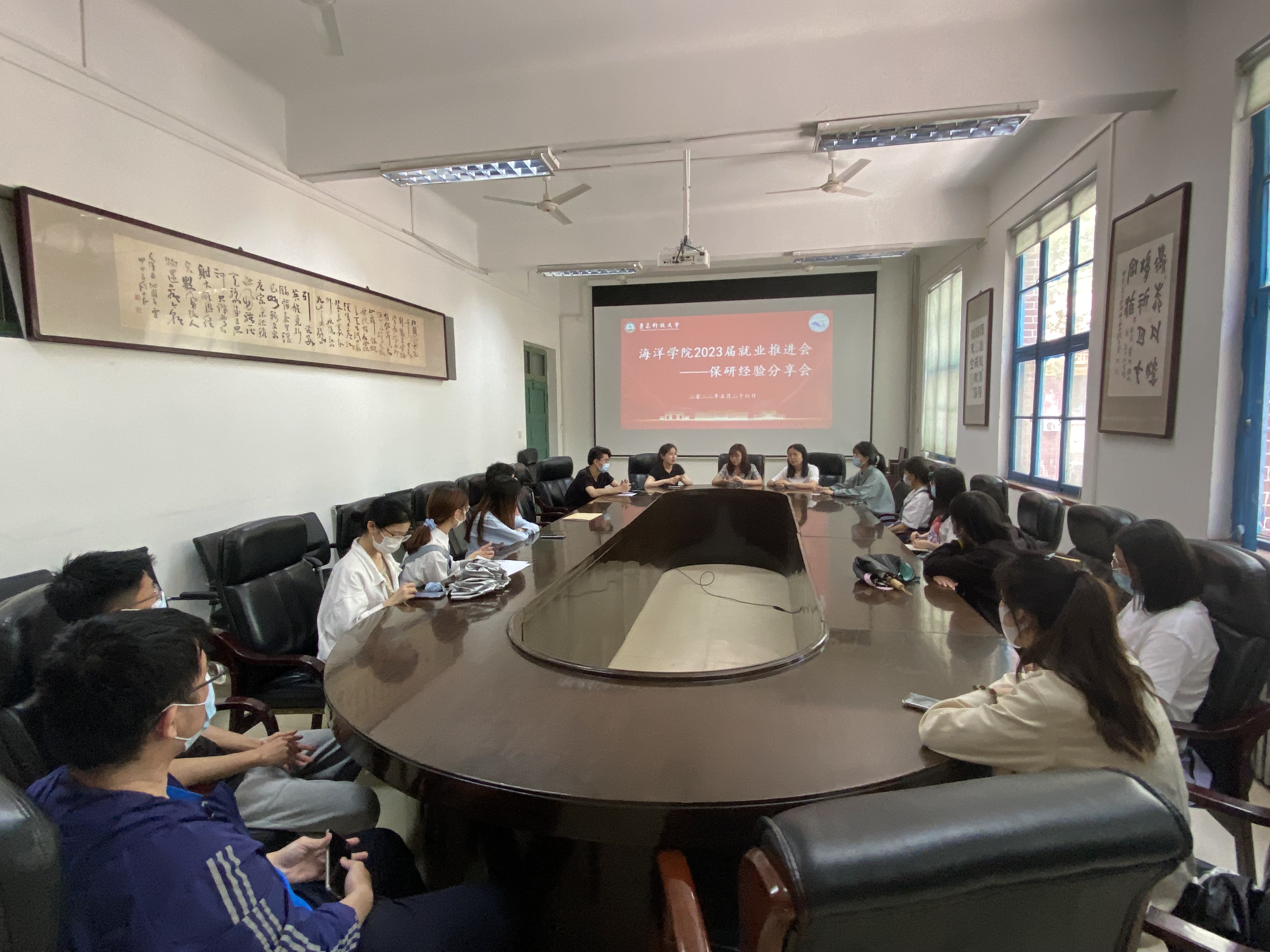 为扎实做好2023届毕业生就业工作,海洋学院召开2023届就业推进会暨保研经验分享会,2022届推免生董丽华(推免至中国海洋大学)、王艺历(推免至中科院化学所)、武咪(推免至天津大学)作经验分享。会议由辅导员李浩老师主持,2019级部分学生参会交流。