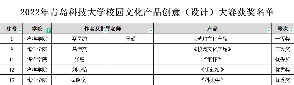 近日,学校对2022年青岛科技大学校园文化产品创意(设计)大赛获奖名单进行公示,海洋学院荣获一等奖1项,三等奖1项,优秀奖3项。