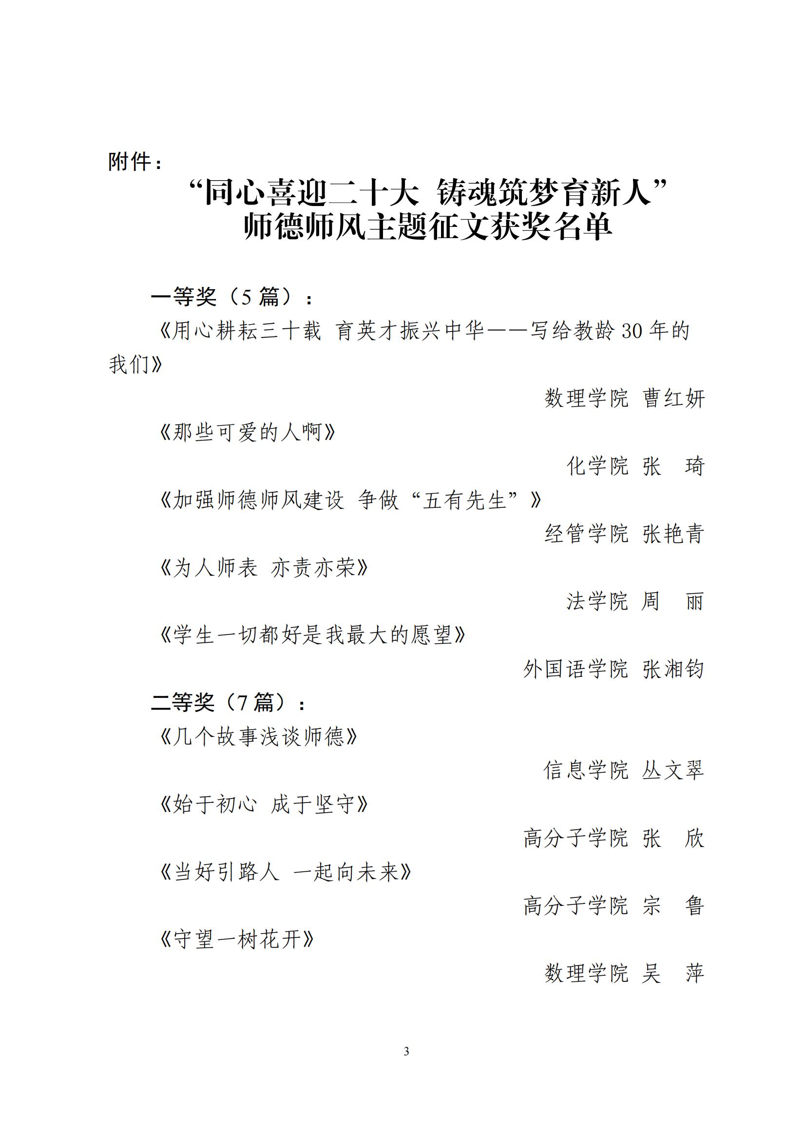 近日,由党委宣传部主办的“同心喜迎二十大 铸魂筑梦育新人”师德师风主题征文活动正式落下帷幕。海洋学院教师积极参与并取得优异成绩。吕珊珊作品《践初心铸师德 强担当立师风》荣获二等奖;王霞作品《爱心与责任铸就师德之魂》荣获三等奖。
