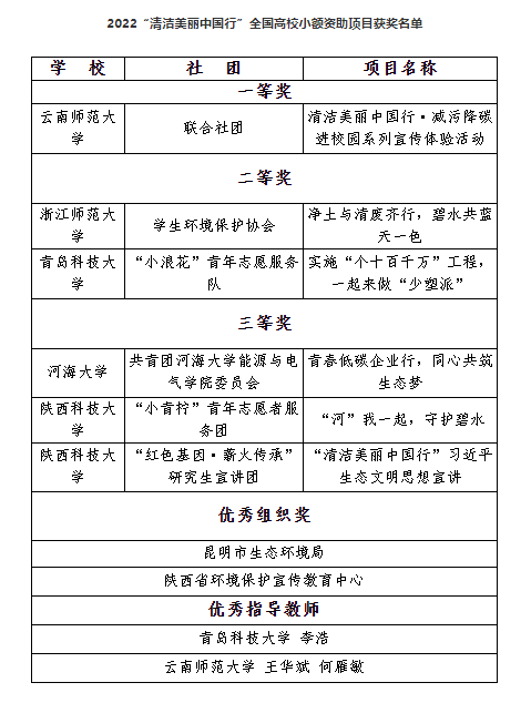 近期,2022“清洁美丽中国行”全国高校小额资助项目获奖名单公布。青岛科技大学海洋学院“小浪花”青年志愿服务队——“实施‘个十百千万’工程,一起来做‘少塑派’”项目获2022“清洁美丽中国行”全国高校小额资助项目二等奖,李浩获“优秀指导教师”。