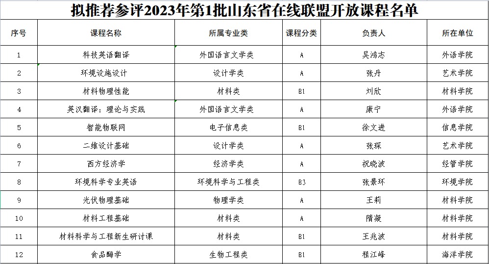 为进一步落实《教育部关于一流本科课程建设的实施意见》(教高〔2019〕8号)、《山东省教育厅关于转发教育部等五部门<关于加强普通高等学校在线开放课程教学管理的若干意见>的通知》(鲁教高函〔2022〕5号)、《山东省高等学校在线开放课程建设实施方案》(鲁教高字〔2017〕11号)等文件要求,持续推进课程共建共享,学校开展了2023年第1批省在线联盟开放课程申报工作,经课程负责人申报,学院推荐,专家组评审,并经校本科教学工作委员会审议,拟推荐20门课程参评2023年第1批山东省在线联盟开放课程评选。
