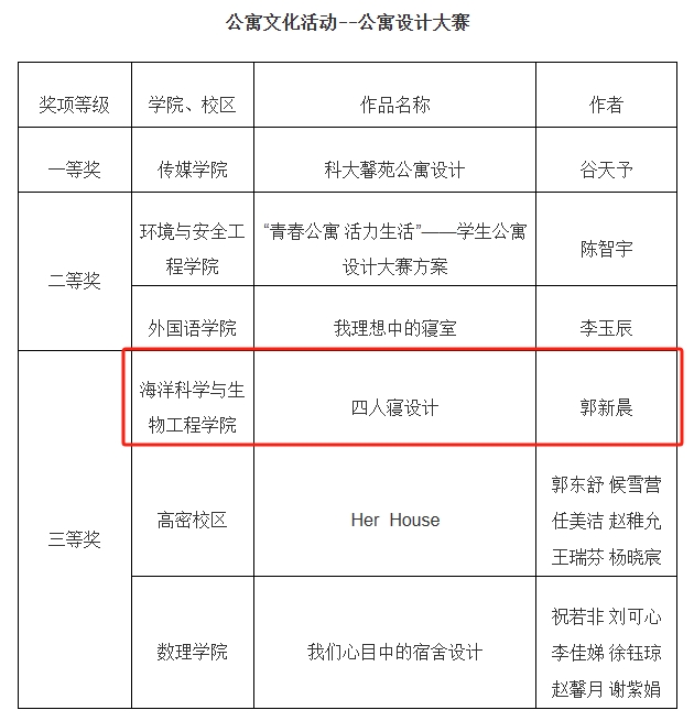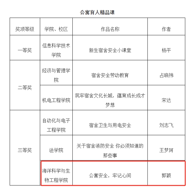 海洋学院举办“公寓的故事”系列活动,遴选出展现新时代学生公寓文化与建设工作风采的优秀作品,报送参选。其中,2023级辅导员郭颖的作品《公寓安全,牢记心间》获公寓育人精品课三等奖、生物233班刘雯的作品《“寓”见美好》获公寓文化活动--微视频三等奖、海洋232班佘涵诺的作品《公寓,我成长的第二个家》获公寓文化活动--征文三等奖、海洋231班郭新晨的作品《四人寝设计》获公寓文化活动--公寓设计大赛三等奖。