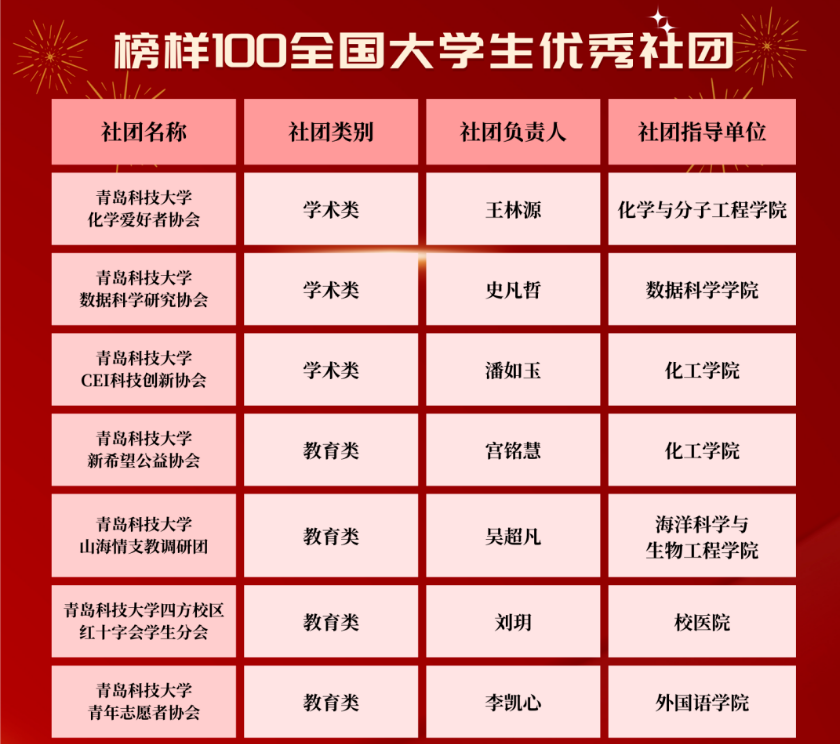 近日,2023年“榜样100”全国优秀大学生社团榜单发布,全国119所高校共计408个社团在此次评选中脱颖而出,其中我院由臧传永老师指导的“青岛科技大学山海情支教调研团”同我校其他12个学生社团一起获评全国大学生优秀社团。