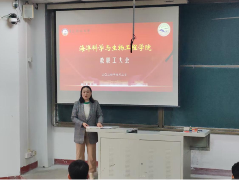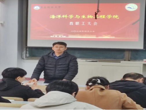 2024年4月2日,海洋科学与生物工程学院在四方校区第二教学楼111室举行全体教职工大会,会议由学院党委书记周宪锋主持,学院班子成员及全体教职工共计48人参加会议,青岛科技大学党委组织部副部长兼干部考核办公室主任卢一宾出席会议。