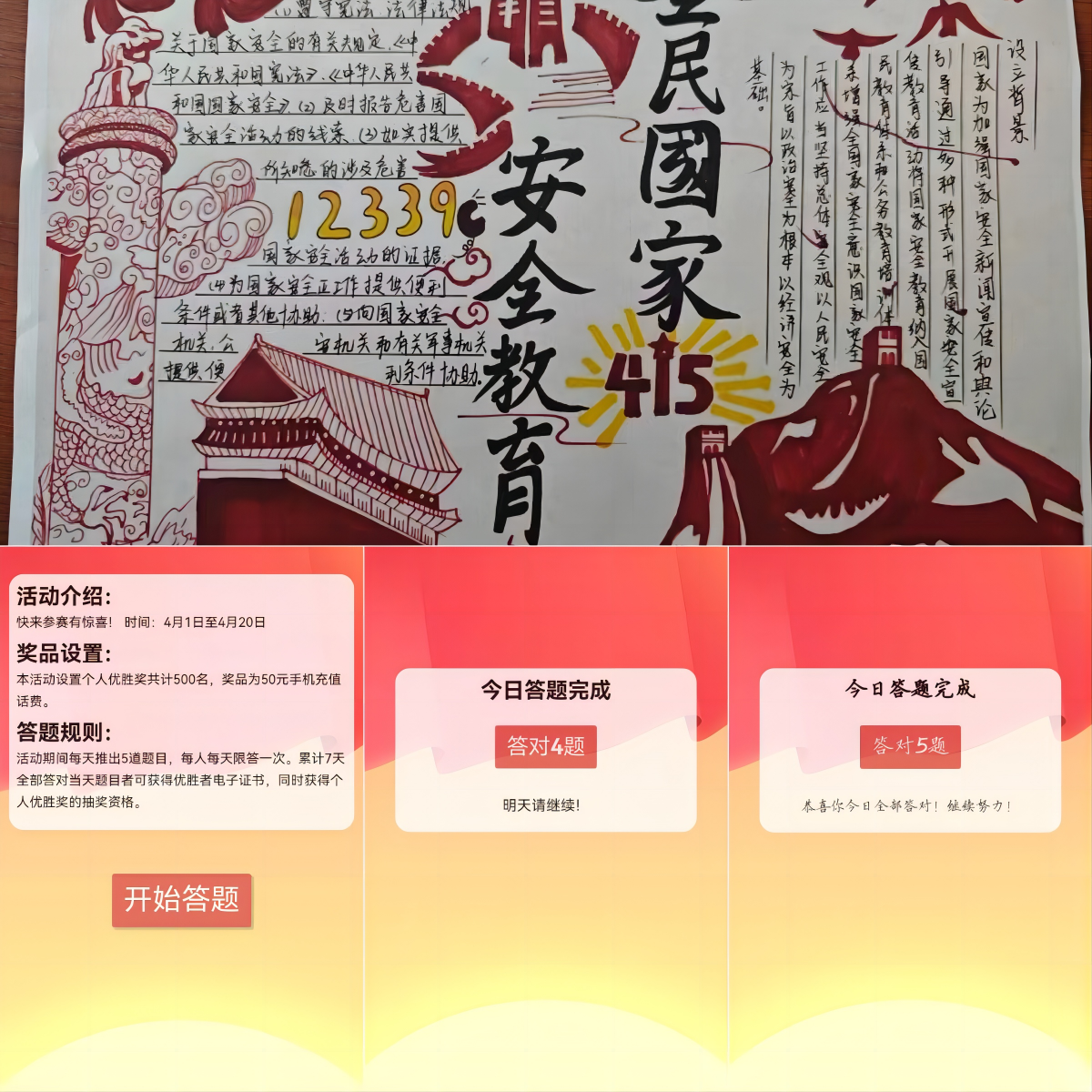 4月17日前,海洋学院开展了以“国家安全在我心,青年奋斗正当时”为主题的国家安全作品征集活动,向青年学生征集国家安全主题的征文、短视频等作品,引导广大青年在作品创作中深刻理解总体国家安全观。各团支部积极参与并提交优秀作品。