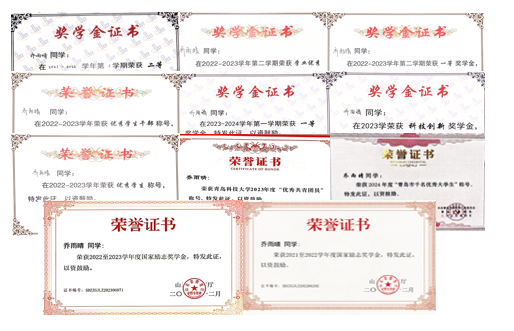 在校期间,累计获得奖励20余项,其中国家级5项、省市级6项、校级11项。获得国家励志奖学金2次、2024年度青岛市千名优秀大学生等奖学金及荣誉称号10余次;在学科竞赛、科技创新领域斩获佳绩,累计获得国家级奖项3项、省级5项、校级2项,能在各方面严格要求自己,是一名德、智、体、美、劳全面发展的优秀学生。