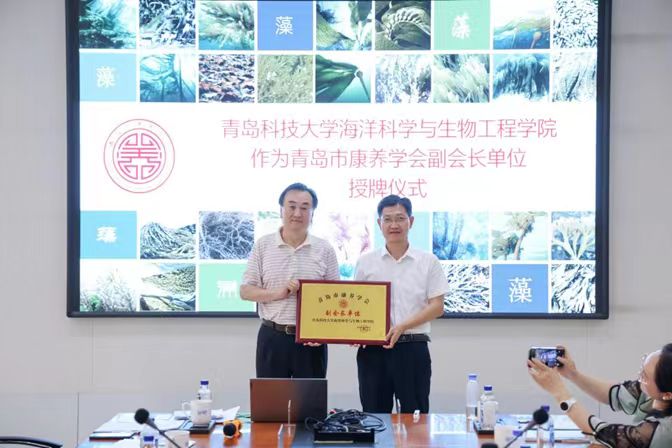 研讨会上,青岛市康养学会授予青岛科技大学海洋科学与生物工程学院副会长单位牌匾。