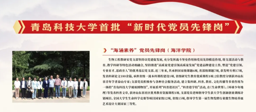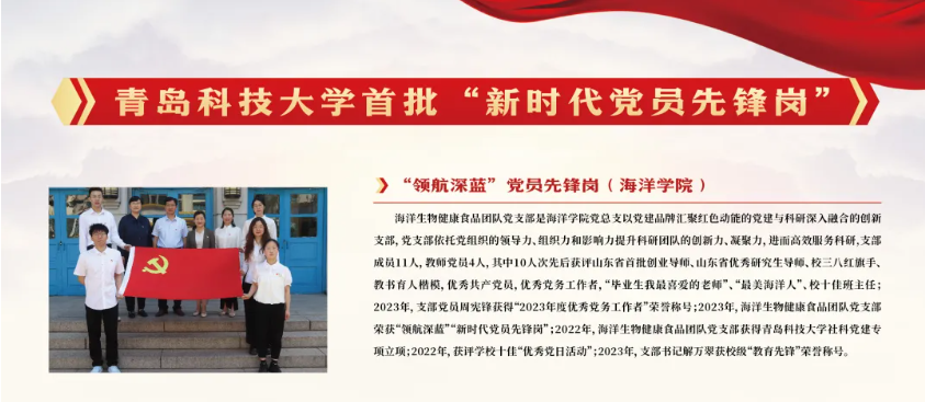 此外,在学校首批“新时代党员先锋岗”评选中,生物工程教研室党支部“海涵素养”党员先锋岗获评学校教书育人党员先锋岗,海洋生物健康食品团队党支部“领航深蓝”党员先锋岗获评学校科研攻关党员先锋岗。