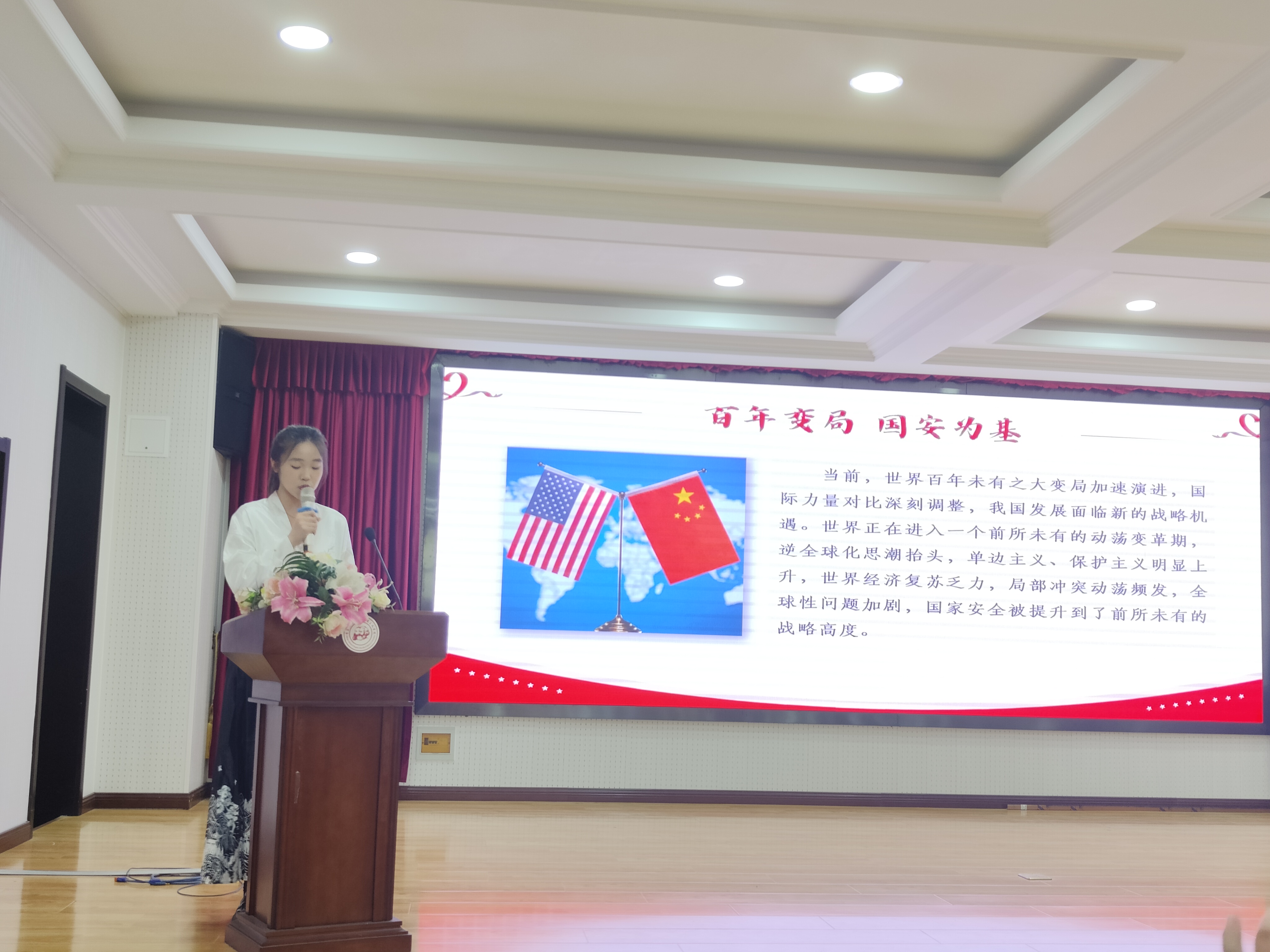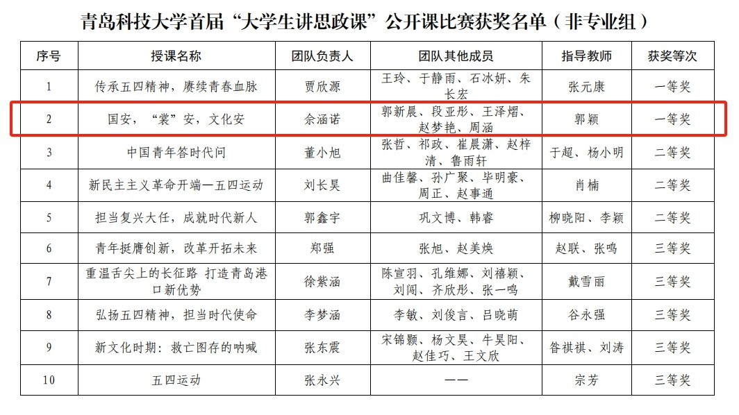 近日,学校首届“大学生讲思政课”公开课比赛结果公布。由佘涵诺、段亚彤、郭新晨、赵梦艳、王泽熠、周涵共同创作的《国安,“裳”安,文化安》在现场评审中获得一等奖第一名的成绩。