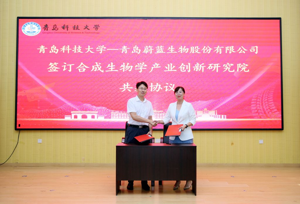 顾玉超介绍了学院的基本情况和发展目标与思路,并代表学院分别与青岛蔚蓝生物股份有限公司、青岛瑞思德生物科技有限公司签订共建合成生物学现代产业研究院、纳米抗体研究联合实验室及科研项目协议。