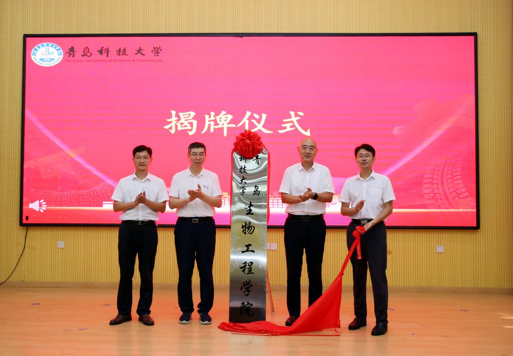 仪式上,张先恩、陈克正、生物工程学院党委书记周宪锋、生物工程学院院长顾玉超共同为生物工程学院揭牌。
