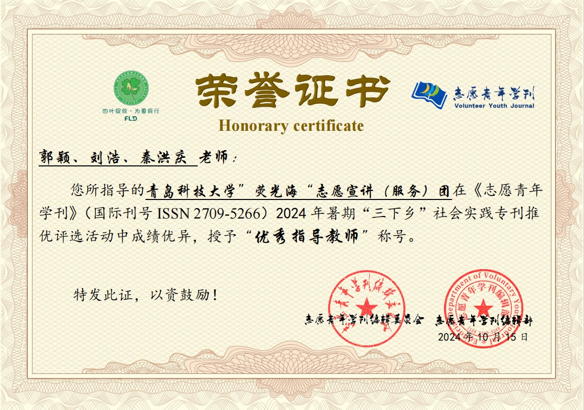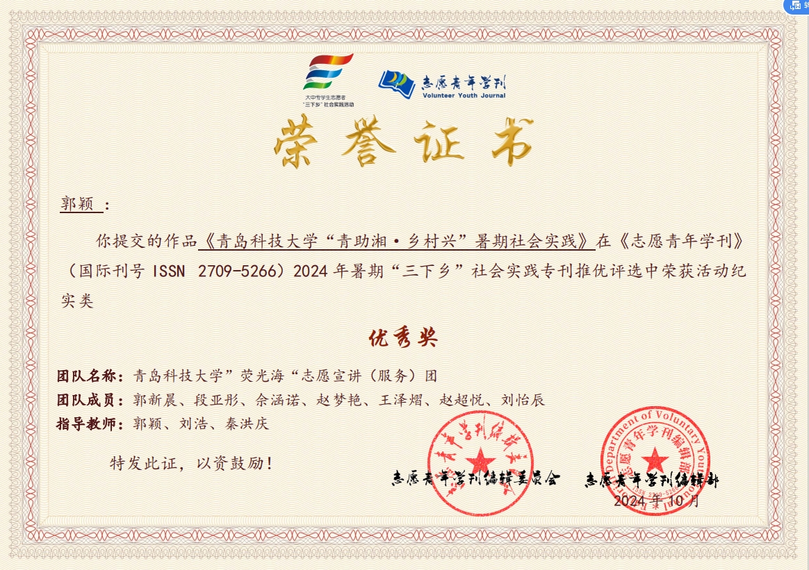 近日,《志愿青年学刊》编辑部2024年暑期“三下乡”社会实践专刊稿件征集评选活动结果公布。生物工程学院“荧光海”志愿宣讲(服务)团在《志愿青年学刊》(国际刊号 ISSN 2709-5266)举办的2024 年暑期“三下乡”社会实践专刊稿件推优评选活动中荣获优秀奖;郭颖、刘浩、秦洪庆荣获优秀指导教师。