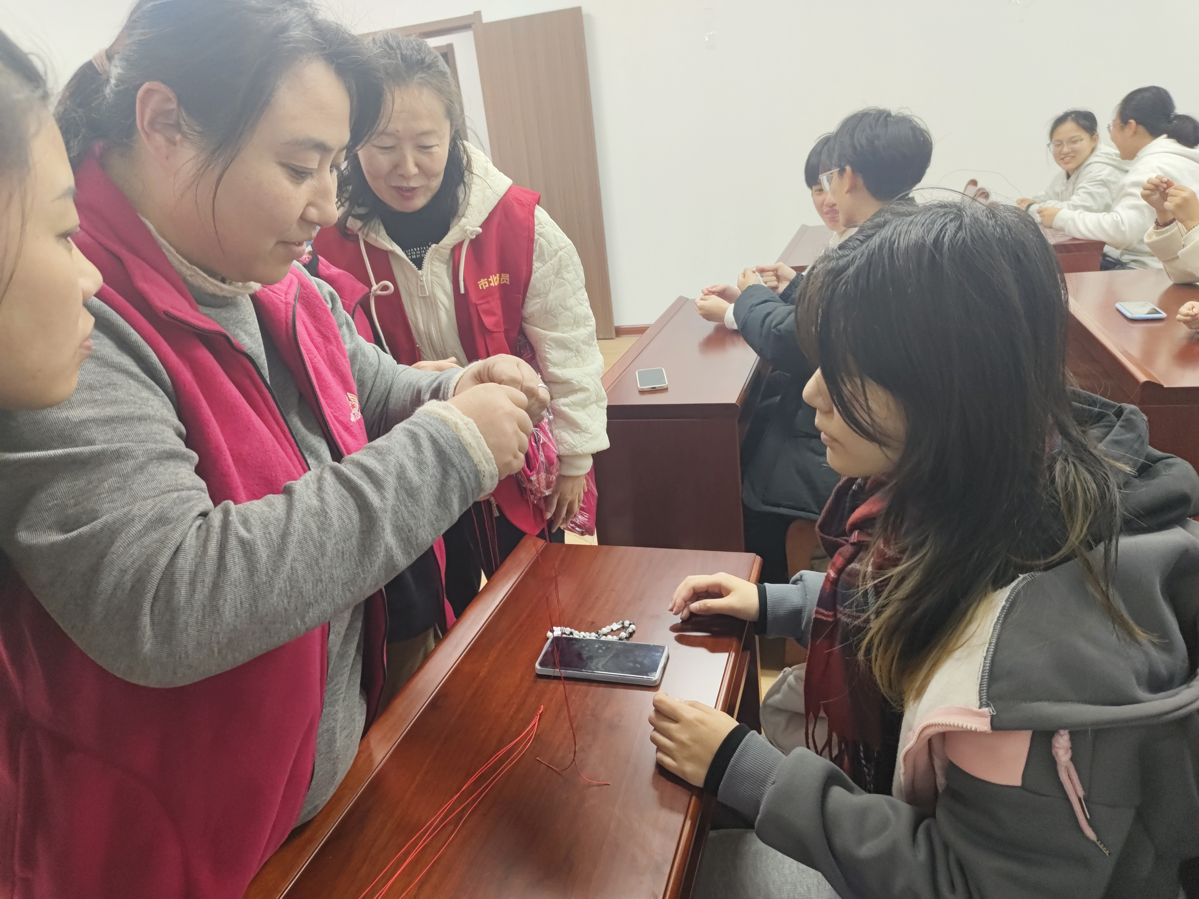 活动现场,青年学生在老师的鼓励和同学们相互帮助下,把看似复杂的一次次绕绳,交织成一根根有特色的手链。每一根手链既有传统元素的再现,也有个性化的创新融入。