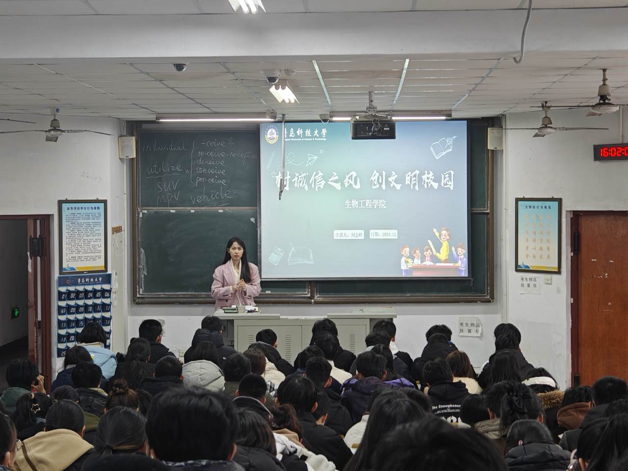 为端正考风考纪,加强学风建设,号召同学们在期末考试中自觉遵守道德规范,营造文明诚信考试的良好氛围,12月24日下午,生物工程学院在一教103举办了“树诚信之风,创文明校园”的主题教育大会,会议由辅导员刘金岭主持,2024级全体学生参加。