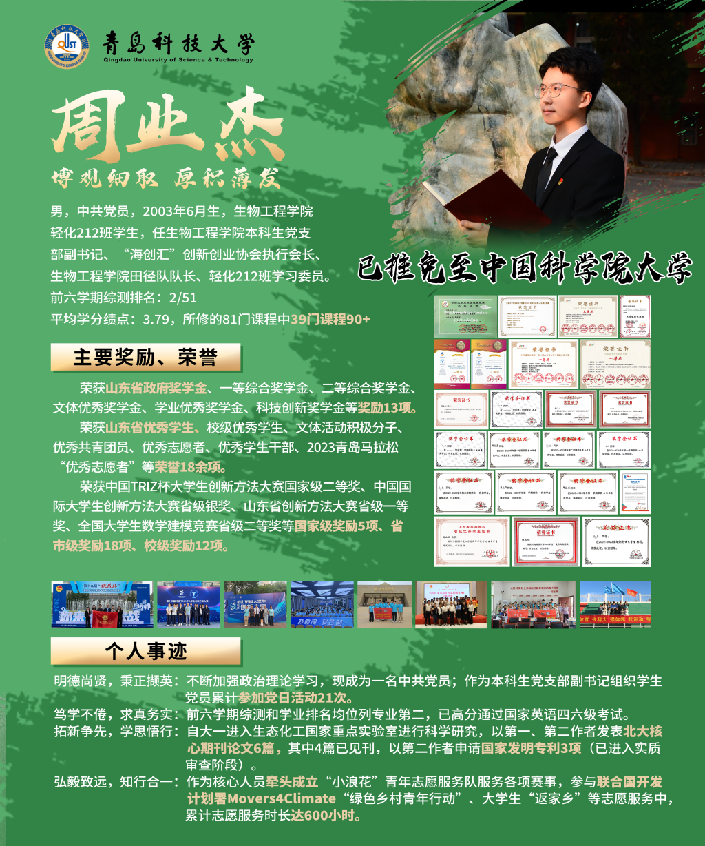 根据《青岛科技大学本科生荣誉奖评选管理办法(修订)》(青科大字﹝2024﹞84号)和《青岛科技大学关于评选第十九届“十大优秀学生”的通知》(青科大学字〔2024〕39号)要求,结合学校实际,按照公开、公平、公正原则,经学院(校区)推荐、资格审核、网络投票、现场汇报、民主投票等环节,生物工程学院轻化212班周业杰获评青岛科技大学第十九届“十大优秀学生”。