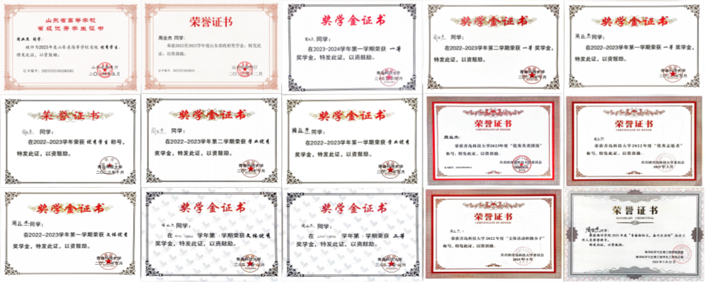 获山东省政府奖学金、校长奖学金、一等综合奖学金、二等综合奖学金、学业优秀奖学金、文体优秀奖学金、科技创新奖学金等奖励20项;获山东省优秀学生、青岛科技大学十大优秀学生、校级优秀学生、校级优秀学生干部、校级优秀共青团员、校级优秀志愿者、校级文体活动积极分子、杰出工作人员、“最美海洋人”、“最美生工人”等荣誉称号25项。