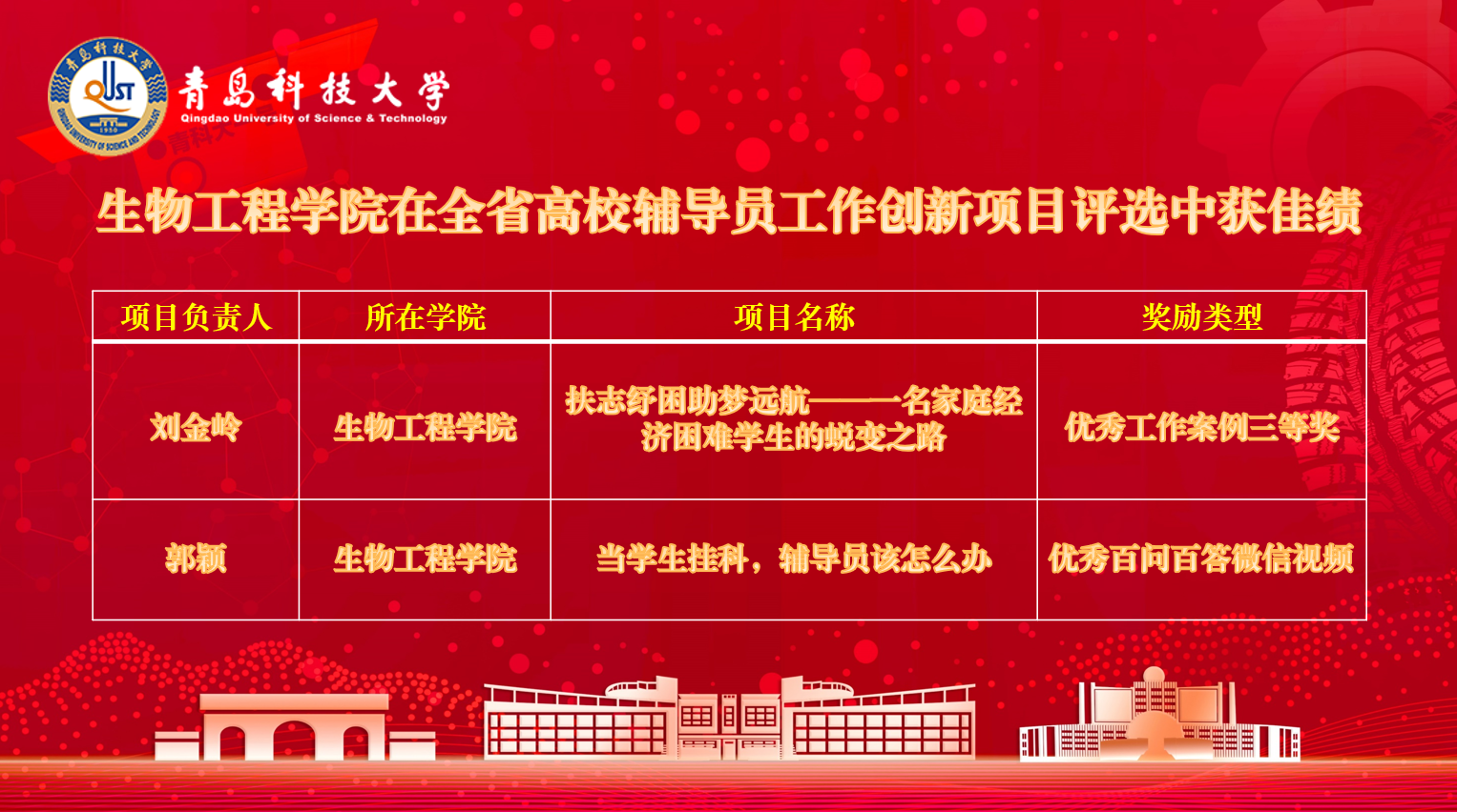 近日,中共山东省委教育工委公布了2024年全省高校辅导员工作创新项目获奖名单。生物工程学院学工办副主任刘金岭老师申报的案例《扶志纾困助梦远航——一名家庭经济困难学生的蜕变之路》获优秀工作案例三等奖、学工办郭颖老师申报的微视频《当学生挂科,辅导员该怎么办》获优秀百问百答微视频。