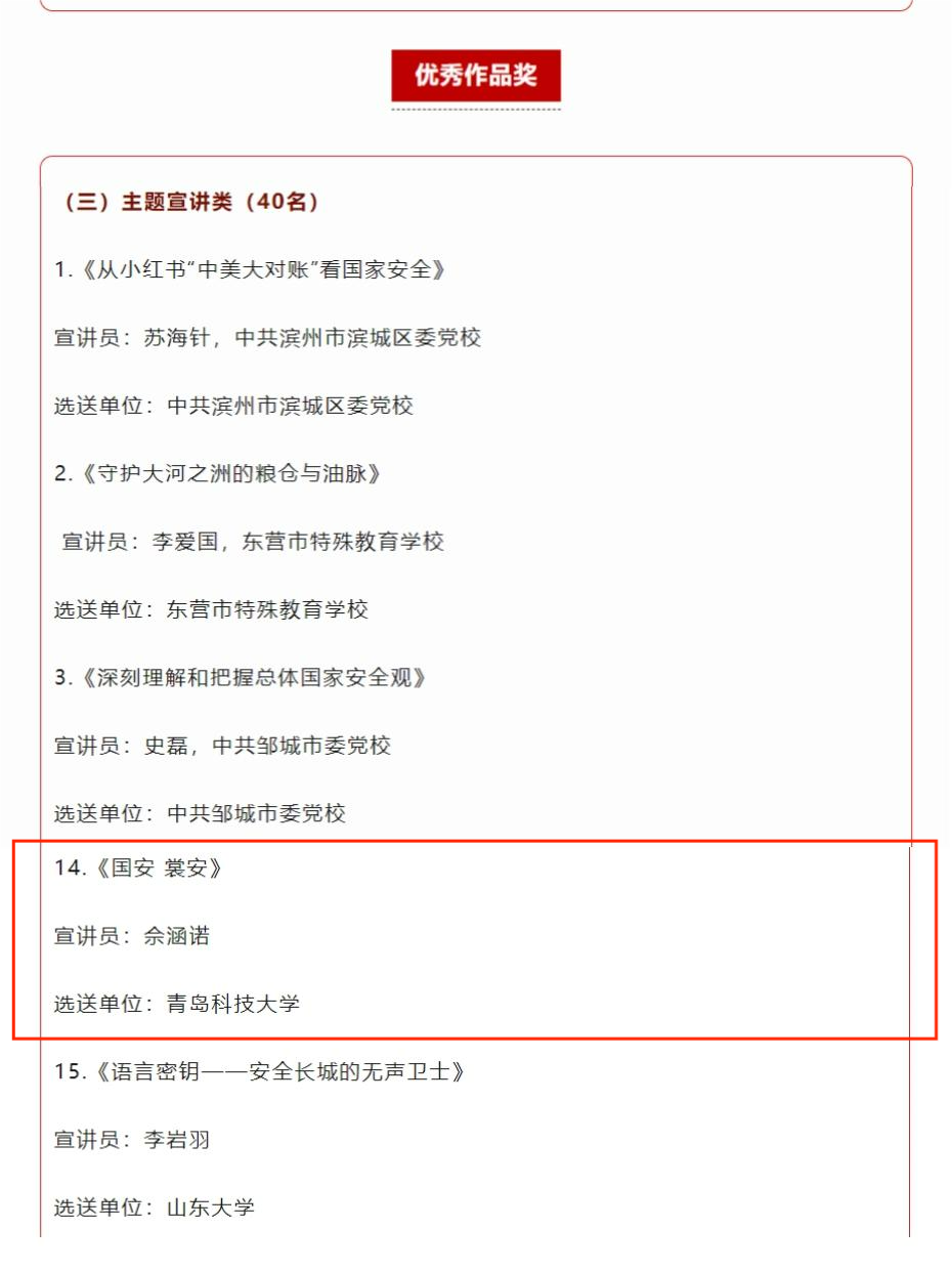 近日,省委国安办、省委宣传部、省委政法委、团省委、省教育厅、省文化和旅游厅、省国家安全厅联合主办山东省第五届全民国家安全宣传教育创意大赛,面向全社会广泛征集创意视频、文艺作品、主题宣讲3类作品。期间,各级各有关部门单位紧紧围绕大赛主题,迅速行动、广泛发动,共征集各类参赛作品数量近8000件,参赛人员遍布全国20余个省、自治区、直辖市。根据组委会评审结果,共评选获奖作品193件、优秀组织奖80个。生物工程学院佘涵诺同学的宣讲作品《国安·裳安》荣获主题宣讲类优秀作品奖。