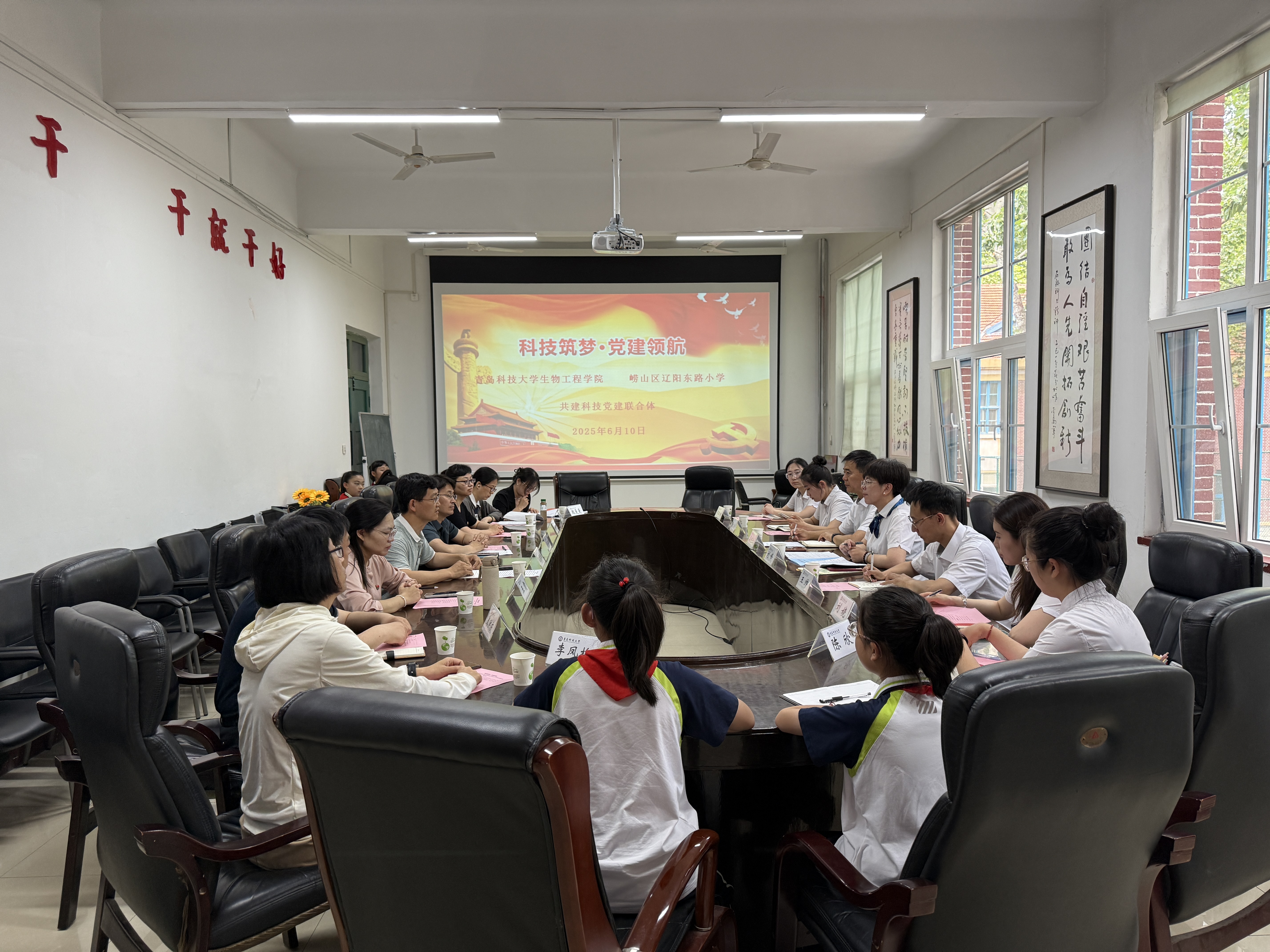 6月10日上午,生物工程学院与崂山区辽阳东路小学“共筑大中小学科技党建联合体”活动在四方校区一号行政楼213会议室举行。辽阳东路小学党支部书记、校长刘峰,副校长姜兆仕,工会主席王帅,办公室主任王文婧以及师生代表。生物工程学院党委书记周宪锋、院长顾玉超、团委书记秦洪庆、生物工程系主任梁成伟、生物工程教研室党支部书记魏曼曼以及党支部委员参加会议。会议由魏曼曼主持。
